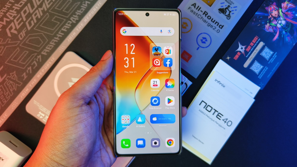 Membuka kotak, penulis disambut dengan Infinix Note 40 yang berada di paling atas, seolah-olah ponsel ini siap menyapa dunia. Di bawahnya, terdapat aksesori standar yang melengkapi pengalaman penggunaan: kabel pengisian USB-C, charger 45 watt yang mendukung pengisian cepat, dan case magnetik yang tidak hanya melindungi tapi juga menambah nilai estetika.