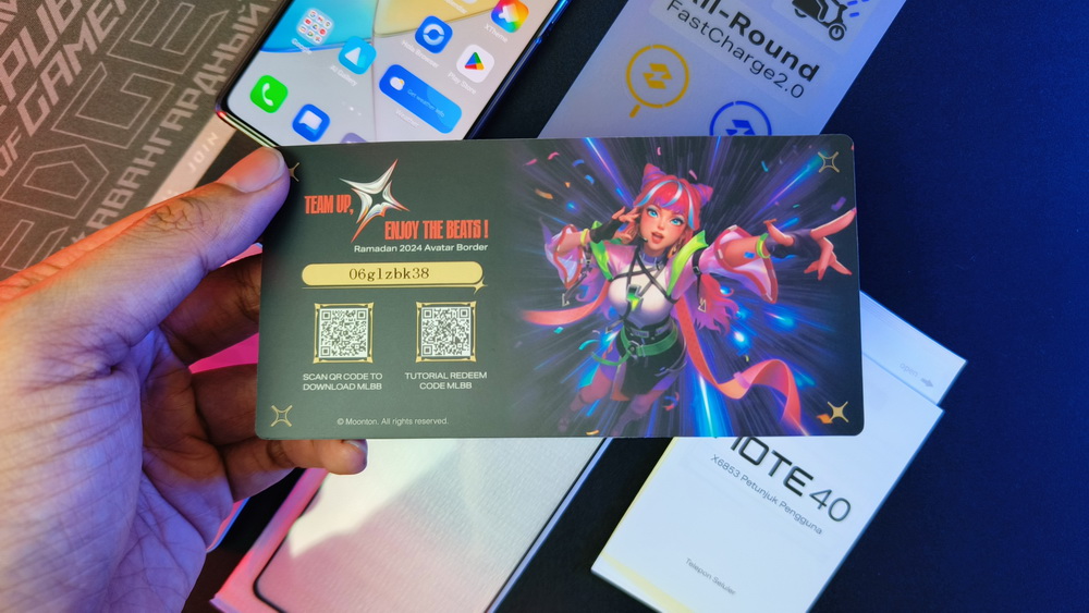 Berbeda dengan seri-seri lainnya, Infinix Note 40 hadir dengan paketan yang sangat menarik untuk dimiliki. Mulai dari kotaknya yang kini memperlihatkan sosok karakter Esmeralda dengan eksklusif dari event All Star yakni Astral Muse. Menandakan kalau Infinix Indonesia serius menggandeng Moonton untuk sebagai partner mereka dan menjamin kalau perangkat ini sangat unggul bermain game Mobile Legends: Bang Bang dengan lancar. Di setiap sisi lainnya, kamu bisa melihat informasi yang menarik seperti adanya fitur NFC dan Splash Proof yang artinya Infinix Note 40 sudah bisa kamu ajak mobilitas tinggi meskipun sedang hujan-hujanan ketika berkendara sepeda motor.