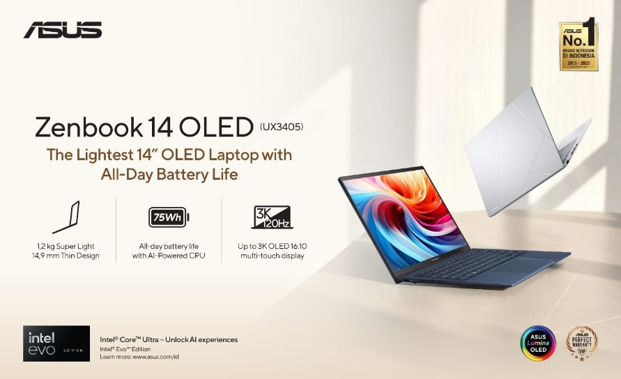 Zenbook 14 OLED (UX3405) sendiri ditenagai oleh prosesor Intel® Core™ Ultra Series terbaru yang sudah dibekali dengan NPU bernama Intel® AI Boost. Kemampuan pemrosesan AI yang lebih baik tidak hanya menjadi keunggulan di laptop ini. Berkat layar ASUS Lumina OLED beresolusi 3K, desain yang sangat portabel dengan bobot hanya 1,2 kg, dibekali fitur canggih, hingga bodi dengan durabilitas berstandar US Military Grade, Zenbook 14 OLED (UX3405) dengan mudah menjadi laptop tipis 14-inci terbaik yang bisa dibeli saat ini.