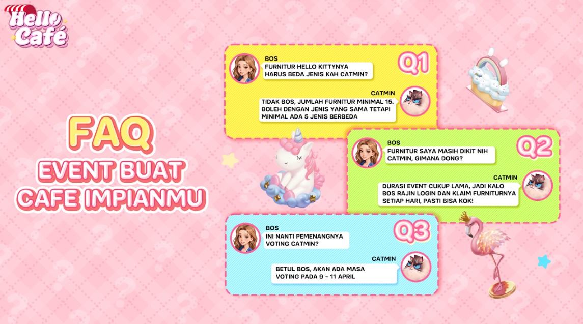 Para pemenang event akan dipilih oleh tim Hello Café berdasarkan jumlah suara terbanyak yang akan di-voting pada periode 9 hingga 11 April 2024. Tiga pemain dengan jumlah voting terbanyak akan diumumkan sebagai pemenang pada tanggal 15 April 2024. Jadi, jangan lewatkan kesempatan ini! Teruslah bermain Hello Café, dekor cafe-mu sekeren mungkin, dan raih hadiah impianmu! Untuk informasi lebih lanjut, pastikan untuk mengikuti akun resmi Hello Café di: