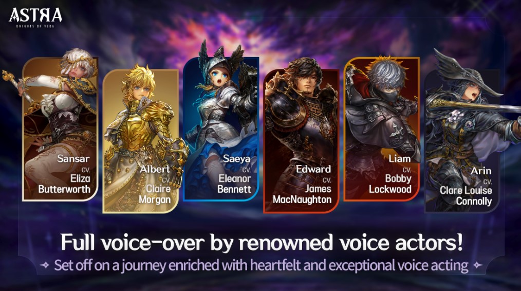 Untuk meningkatkan pengalaman para pemain dan melengkapi alur ceritanya, ASTRA: Knights of Veda menawarkan fitur full voice dalam bahasa Korea, Inggris, dan Jepang, termasuk juga 13 bahasa untuk subtitle demi menjamin kenyamanan pengguna secara global.