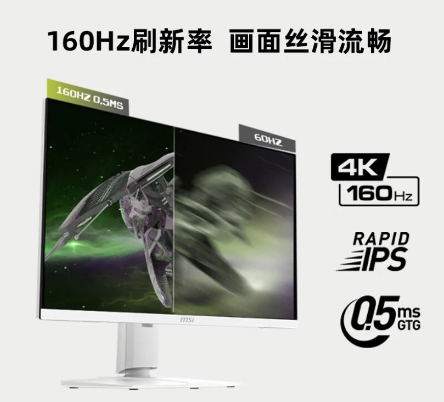 MAG 274URFW menampilkan panel Rapid IPS 4K berukuran 27 inci dengan resolusi 3840 x 2160 piksel, memberikan visual yang tajam dan detail untuk gaming, konten kreatif, dan hiburan. Layar ini memiliki refresh rate 160Hz dan waktu tanggap 0,5ms GtG (gray-to-gray) yang memastikan gameplay yang mulus tanpa motion blur, mengurangi efek ghosting dan trailing, sangat cocok untuk judul-judul yang bergerak cepat.