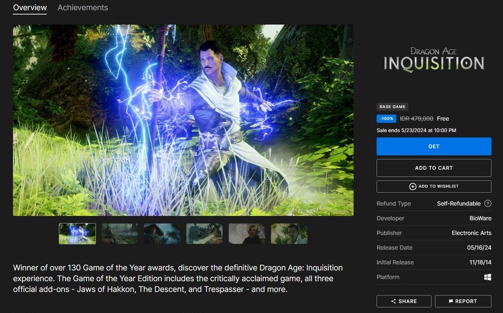 Giveaway Dragon Age: Inquisition – GOTY Edition ini berlangsung hingga 23 Mei 2024. Para pemain yang belum pernah mencoba game ini memiliki kesempatan emas untuk menikmati salah satu RPG terbaik dari BioWare tanpa harus mengeluarkan uang sepeser pun. Yang perlu dilakukan hanyalah mengunjungi Epic Games Store, membuat akun jika belum punya, dan mengklaim game ini sebelum batas waktu yang ditentukan.