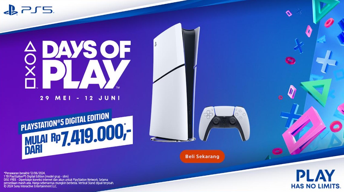 Sony mengumumkan event tahunan mereka, Days of Play 2024, yang akan berlangsung dari tanggal 29 Mei hingga 12 Juni 2024. Selama periode ini, harga konsol PS5 dan perangkat pendukungnya akan mendapatkan diskon besar-besaran.