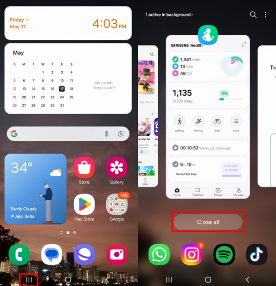 Lalu tutup aplikasi-aplikasi lain yang aktif pada background untuk agar memori dan kapasitas processing dapat difokuskan ke game yang kamu mainkan. Untuk menutup aplikasi yang aktif di background di Galaxy A35 5G, caranya: