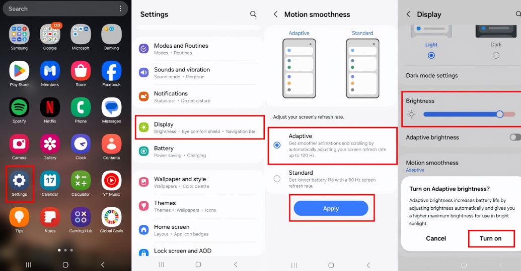 - Tap pada Motion smoothness, Pilih Adaptive untuk mendapatkan refresh rate 120Hz.