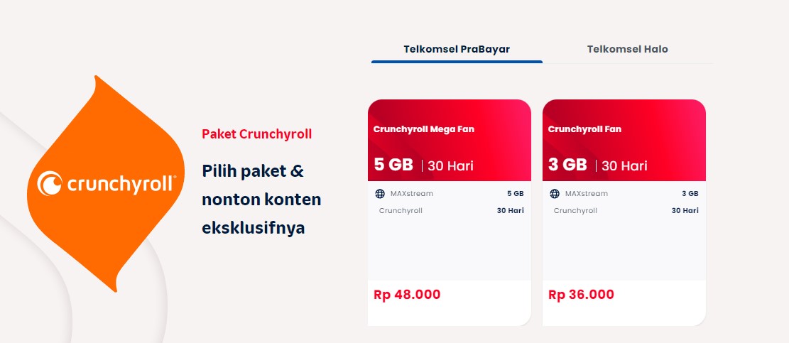 Pelanggan Telkomsel, baik pengguna Prabayar maupun Halo (pascabayar), dapat dengan mudah membeli Paket Bundling Telkomsel dan Crunchyroll melalui aplikasi MyTelkomsel. Terdapat Paket Crunchyroll Fan seharga Rp36 ribu dengan Kuota MAXstream 3 GB yang dapat digunakan pada 1 device saja, dan Paket Crunchyroll Mega Fan seharga Rp48 ribu dengan Kuota MAXstream 5 GB yang dapat gunakan untuk 4 device secara bersamaan.