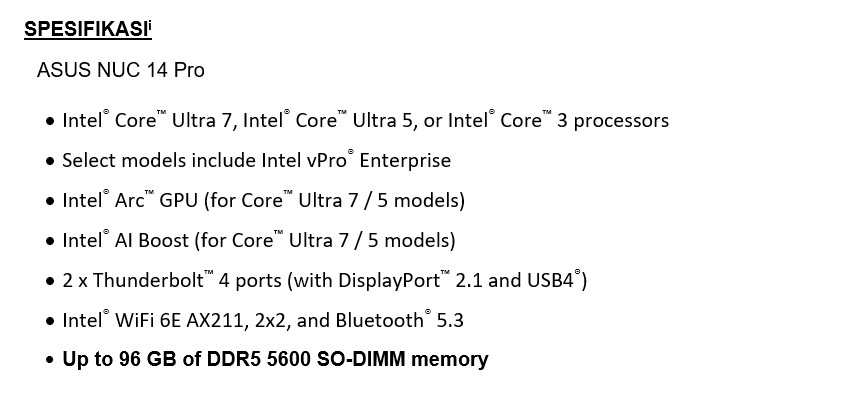 ASUS NUC 14 Pro yang merupakan ultra-small form factor (USFF) didukung oleh prosesor terbaru dari Intel dengan menggunakan Intel Generasi 14 yaitu Meteor Lake, mulai dari Intel Core 3, Ultra 5, Ultra 7, dan Ultra 9. ASUS NUC 14 Pro merupakan NUC pertama yang siap mendukung AI karena dibekali dengan Intel WiFi 6E AX211 berkecepatan tinggi, Intel vPro® Enterprise, dan dukungan hingga empat layar eksternal. Dengan kinerja unggul dan desain yang ringkas, NUC 14 Pro dapat memenuhi beragam kebutuhan profesional modern.
