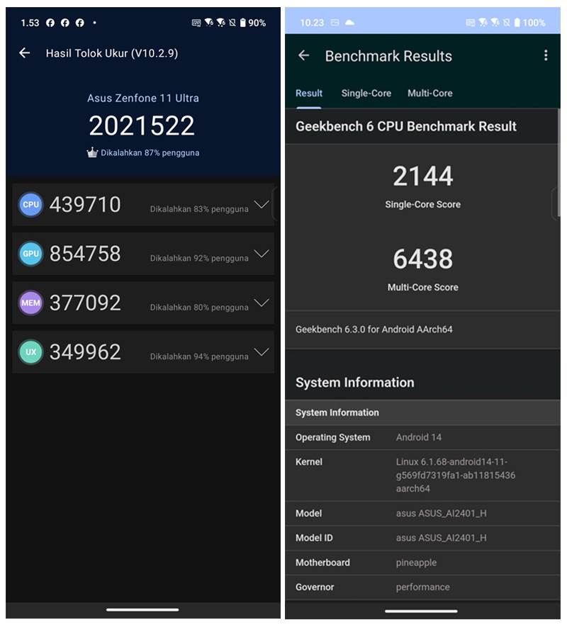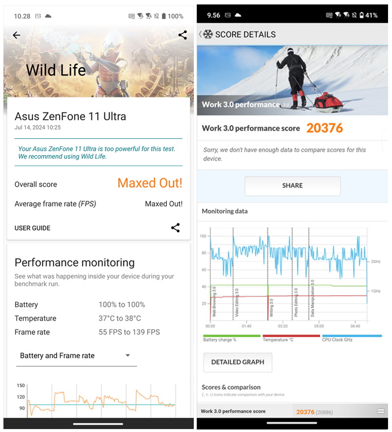 Ditenagai oleh Snapdragon 8 Gen 3, Zenfone 11 Ultra memberikan performa luar biasa. Pada tes benchmark AnTuTu, ponsel ini mencetak skor 2.021.522. Pada Geekbench 6, skor single-core mencapai 2144 dan multi-core 6438, sementara untuk 3DMark Wilf Life mendapatkan skor MAXED OUT!  dan PCMark mendapatkan skor 20376.
