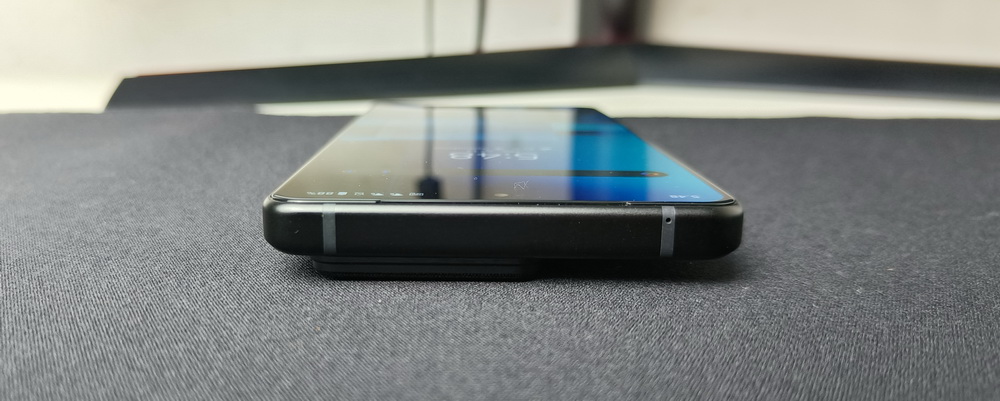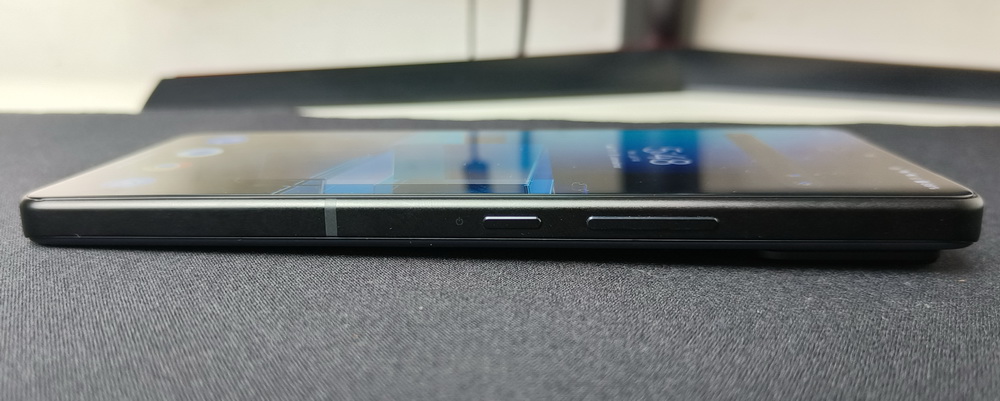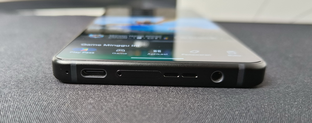 Pada sisi kiri, terdapat tombol volume up & down serta tombol power. Sisi atas hanya memiliki satu lubang mikrofon. Sisi bawah dilengkapi dengan jack audio 3,5mm, speaker, slot sim card yang mendukung dual sim, slot USB type-C, dan lubang mikrofon. Sisi kanan kosong, memberikan tampilan yang clean. Ponsel ini hadir dalam tiga varian warna yaitu Skyline Blue, Eternal Black, dan Misty Grey, dengan berat 225g.