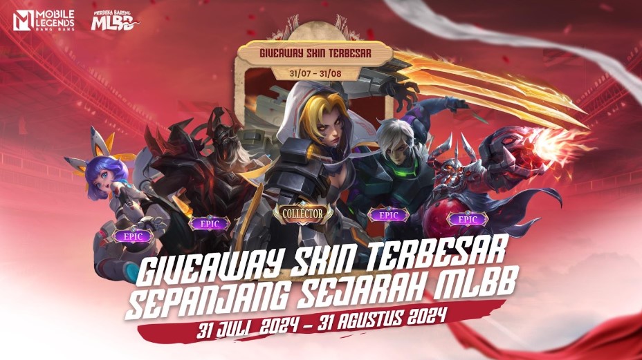 Nantikan juga, giveaway skin terbesar sepanjang sejarah Mobile Legends: Bang Bang yang bisa dinikmati oleh para pengguna MLBB mulai dari 31 July – 31 Agustus 2024 dalam rangka memperingati ulang tahun Moonton yang ke-10 beserta perayaan kemerdekaan Indonesia ke-79. Dalam giveaway ini, Mobile Legends: Bang Bang akan membagikan Skin Collector terbaru dan 4 epik skin permanen secara GRATIS!