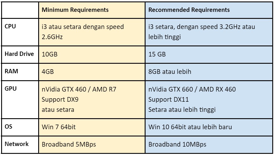 Spesifikasi perangkat untuk memainkan Heavenly Sword Online bisa dilihat di bawah ini.