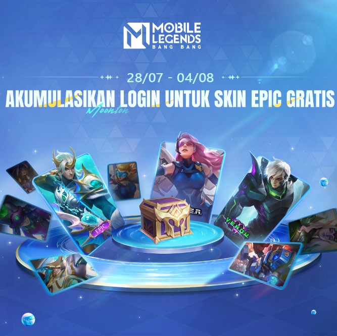 Moonton Games akan memberikan skin epic secara gratis kepada pemain, hanya dengan login ke dalam game dalam periode 28 Juli – 4 Agustus 2024. Caranya, para pemain hanya cukup masuk ke dalam game dan melakukan klaim di tab event untuk mendapatkan hadiah skin epic.