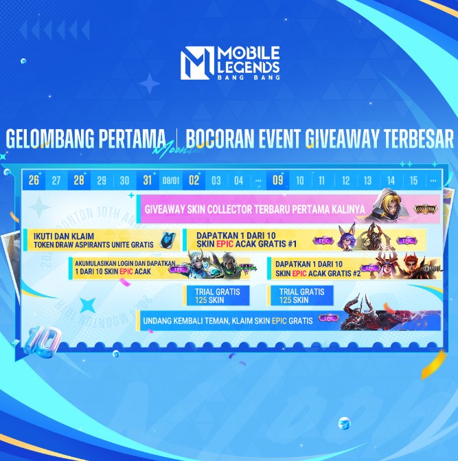 Merayakan ulang tahun ke-10 dari Moonton Games, pengembang sekaligus penerbit dari game Mobile Legends: Bang Bang ini akan mengadakan event yang sangat spektakuler dengan memberikan banyak hadiah, mulai dari skin epic hingga skin collector bagi para pemainnya pada bulan Agustus nanti.