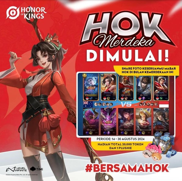 Honor of Kings berpartisipasi dalam memeriahkan Hari Kemerdekaan Republik Indonesia ke-79 dengan meluncurkan tagline #BersamaHOK, menghadirkan berbagai aktivitas seru yang dapat dinikmati oleh komunitas di Indonesia.
