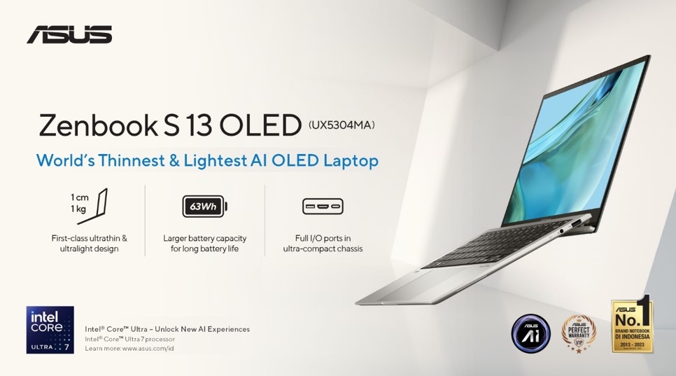 Ingin laptop yang tidak hanya tipis dan ringan, tetapi juga memiliki port yang lengkap? ASUS Zenbook S 13 OLED (UX5304MA) adalah jawabannya. Laptop tipis ultraportabel ini hadir dengan desain yang memukau dan performa terbaik di kelasnya, menjadikannya pilihan sempurna bagi Anda yang membutuhkan mobilitas tinggi tanpa mengorbankan kinerja.