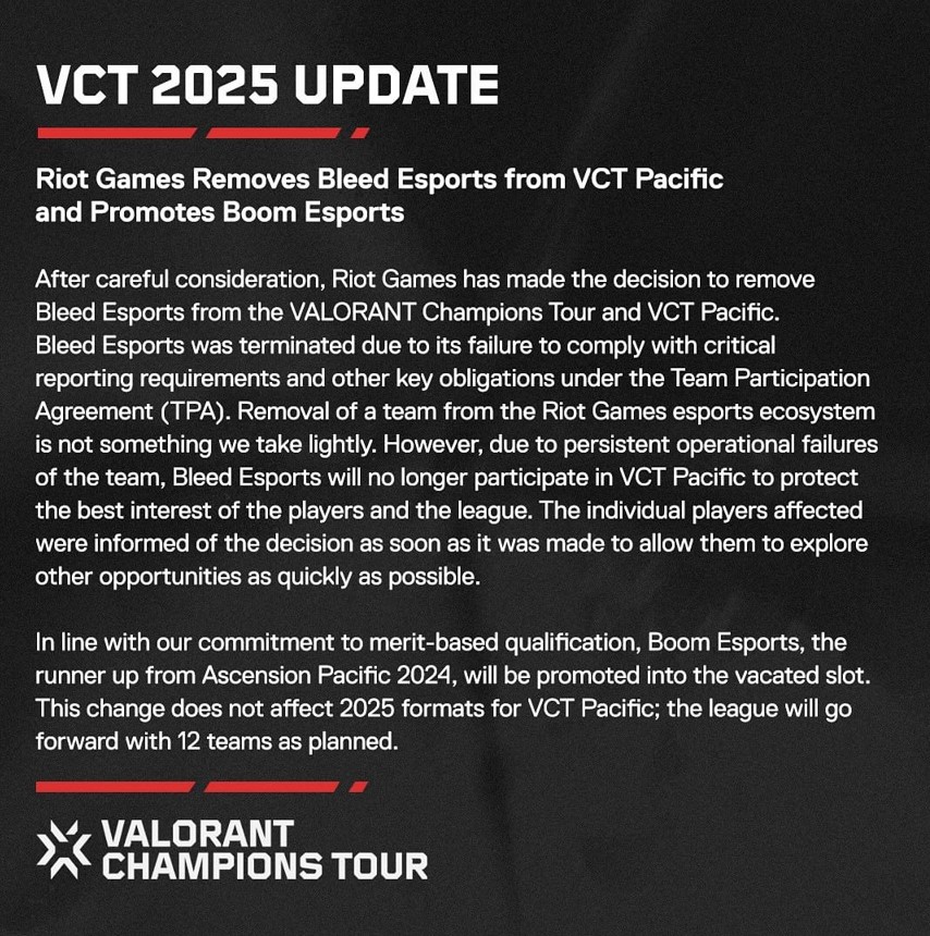 Dunia kompetitif Valorant di kawasan Asia Pasifik baru-baru ini diguncang oleh kabar mengejutkan: Bleed Esports, tim yang sebelumnya berlaga di Valorant Champions Tour (VCT) Pacific, resmi dikeluarkan dari turnamen tersebut. Langkah ini diambil oleh Riot Games setelah Bleed Esports gagal memenuhi kewajiban operasional dan persyaratan penting yang menjadi dasar partisipasi mereka di VCT.