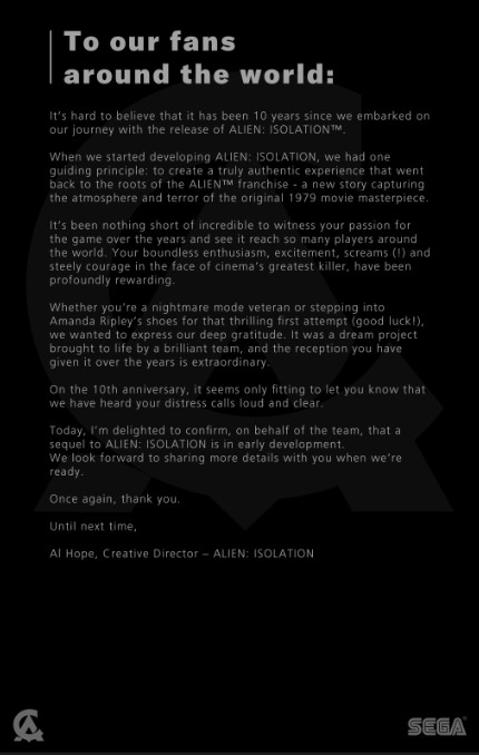“Pas di hari ulang tahun ke-10, rasanya pas banget buat kasih tahu kalau kami denger sinyal darurat dari kalian dengan jelas,” tulis Hope. “Hari ini, aku seneng banget bisa konfirmasi, atas nama tim, kalau sekuel Alien: Isolation lagi dalam pengembangan awal. Kami nggak sabar buat berbagi info lebih lanjut pas waktunya tiba.”