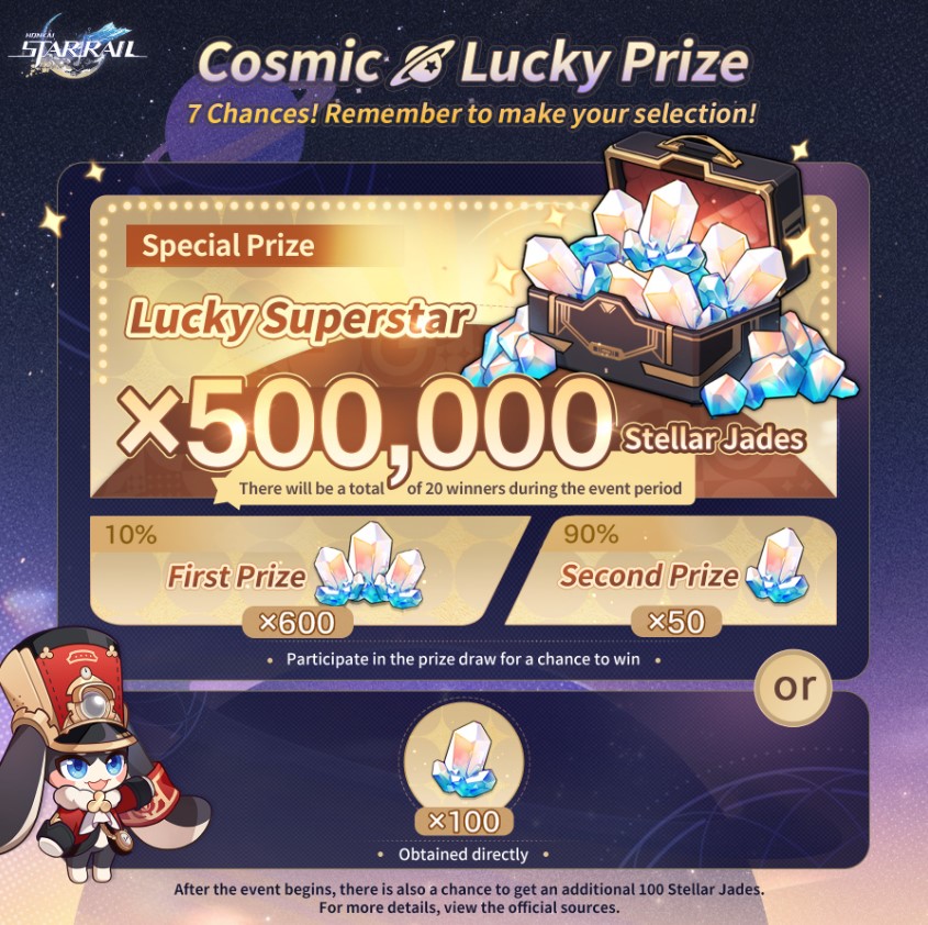 Dalam event Cosmic Lucky Prize, pemain bisa memilih antara menarik hadiah tetap sebanyak 100 Stellar Jades setiap hari atau ikut serta dalam lotere dengan peluang memenangkan 500.000 Stellar Jades.