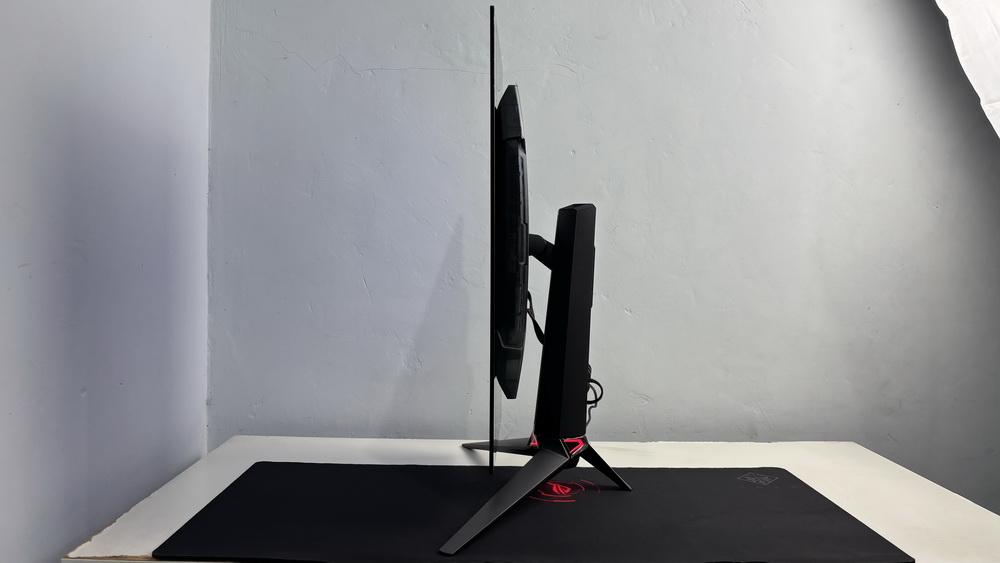 ASUS ROG Swift OLED PG27AQDP hadir dengan pendekatan desain yang elegan namun tetap mencerminkan DNA khas ROG. Gaya desainnya agresif, tapi tidak berlebihan—memberikan kesan profesional yang tetap stylish untuk setup gaming modern. Stand-nya terasa kokoh dan dirancang sangat fleksibel, dengan kemampuan tilt, swivel, pivot, serta penyesuaian tinggi, sehingga memudahkan pengguna menemukan sudut pandang paling nyaman.